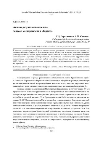 Библиографическое описание: Гарькавенко, С. Д. Анализ результатов подсчета запасов месторождения "Герфед" = Analysis of the Reserves Estimation Results for the Gerfed Gold Deposit / С. Д. Гарькавенко, А. М. Сазонов. - Текст : непосредственный // Журнал Сибирского федерального университета. Техника и технологии. - 2013. - Т. 6, № 7. - С. 739-749 : рис., табл. - Библиогр.: с. 748-749. - ISSN 1999-494X.