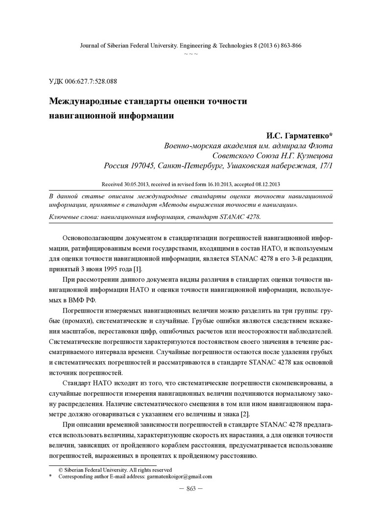 Библиографическое описание:Гарматенко, И. С. Международные стандарты оценки точности навигационной информации / И. С. Гарматенко. - Текст : непосредственный // Журнал Сибирского федерального университета. Техника и технологии. - 2013. - Т. 6, № 8. - С. 863-866 : табл., формулы. - Библиогр.: с. 865. - ISSN 1999-494X.