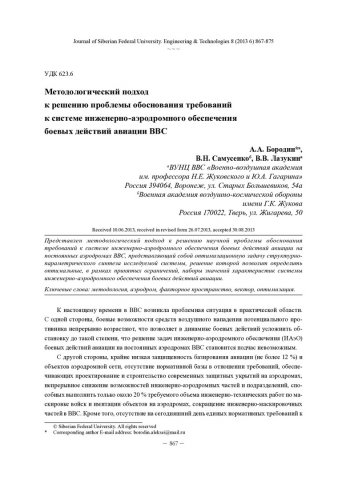 Библиографическое описание:Бородин, А. А. Методологический подход к решению проблемы обоснования требований к системе инженерно-аэродромного обеспечения боевых действий авиации ВВС / А. А. Бородин, В. Н. Самусенко, В. В. Лазукин. - Текст : непосредственный // Журнал Сибирского федерального университета. Техника и технологии. - 2013. - Т. 6, № 8. - С. 867-875 : рис., формулы. - Библиогр.: с. 874. - ISSN 1999-494X.
