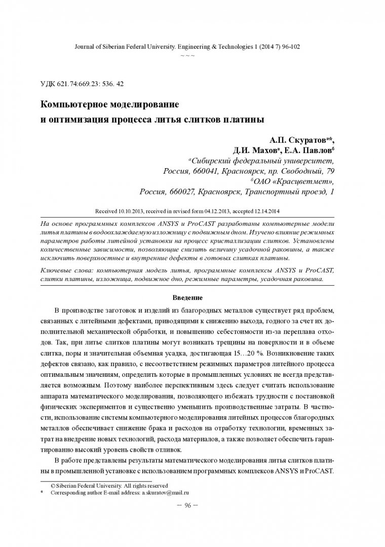 Библиографическое описание: Скуратов, А. П. Компьютерное моделирование и оптимизация процесса литья слитков платины = Computer Simulation and Optimization Casting Process Ingot Platinum / А. П. Скуратов, Д. И. Махов, Е. А. Павлов. - Текст : непосредственный // Журнал Сибирского федерального университета. Техника и технологии. - 2014. - Т. 7, № 1. - С. 96-102 : рис., формулы. - Библиогр.: с. 102. - ISSN 1999-494X.