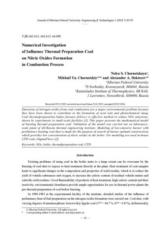 Numerical Investigation oF Influence Thermal Preparation Coal on Nitric Oxides Formation in Combustion Processстатья из журнала