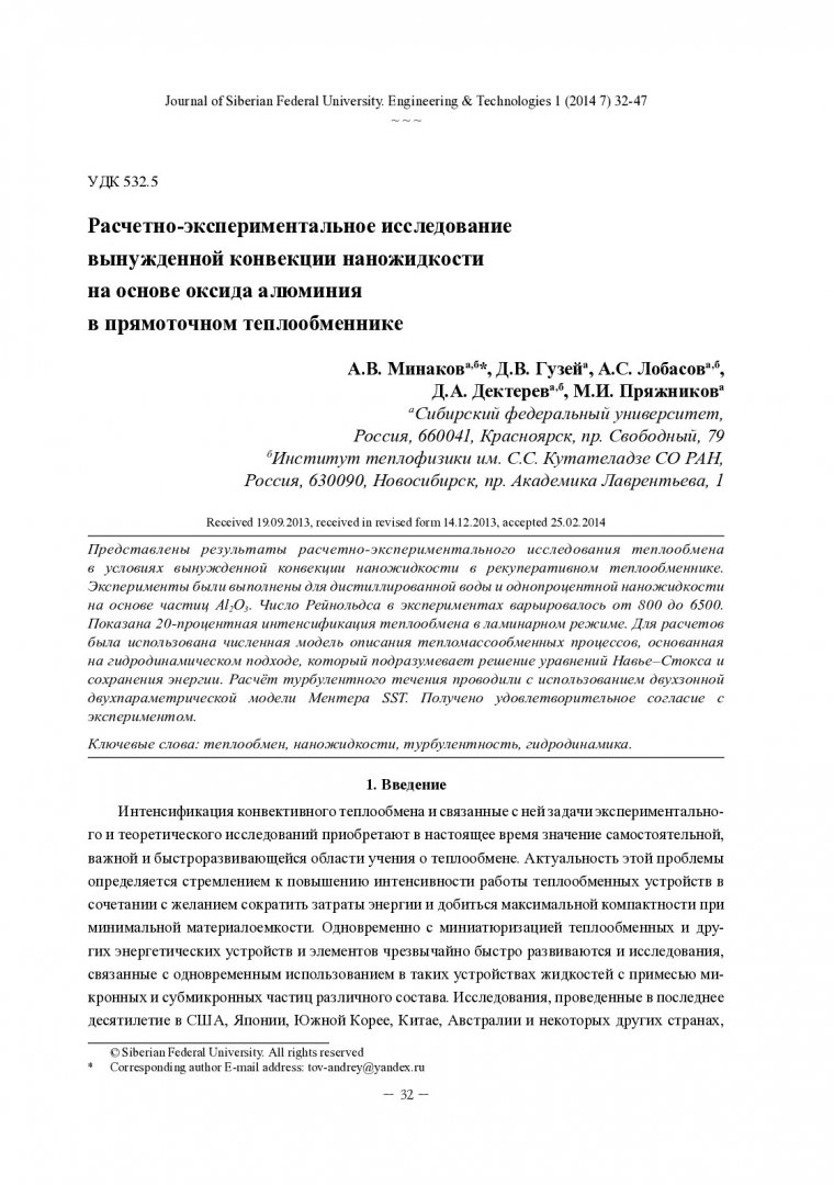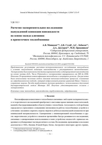 Библиографическое описание: Расчетно-экспериментальное исследование вынужденной конвекции наножидкости на основе оксида алюминия в прямоточном теплообменнике = Experiment-Calculated Investigation of Forced Convection of Alumina Nano? uid in Direct Flow Heat Exchanger / А. В. Минаков [и др.]. - Текст : непосредственный // Журнал Сибирского федерального университета. Техника и технологии. - 2014. - Т. 7, № 1. - С. 32-47 : рис., формулы. - Библиогр.: с. 46. - ISSN 1999-494X.