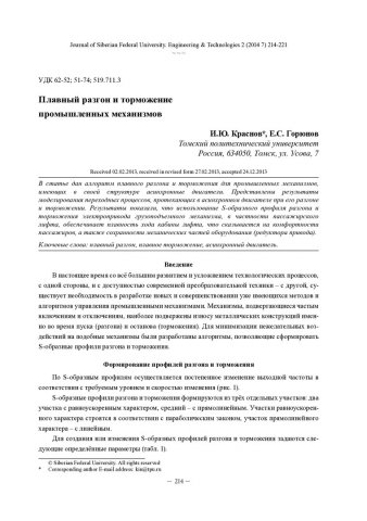 Аннотация: В статье дан алгоритм плавного разгона и торможения для промышленных механизмов, имеющих в своей структуре асинхронные двигатели. Представлены результаты моделирования переходных процессов, протекающих в асинхронном двигателе при его разгоне и торможении. Результаты показали, что использование S-образного профиля разгона и торможения электропривода грузоподъемного механизма, в частности пассажирского лифта, обеспечивает плавность хода кабины лифта, что сказывается на комфортности пассажиров, а также сохранности механических частей оборудования (редуктора привода).