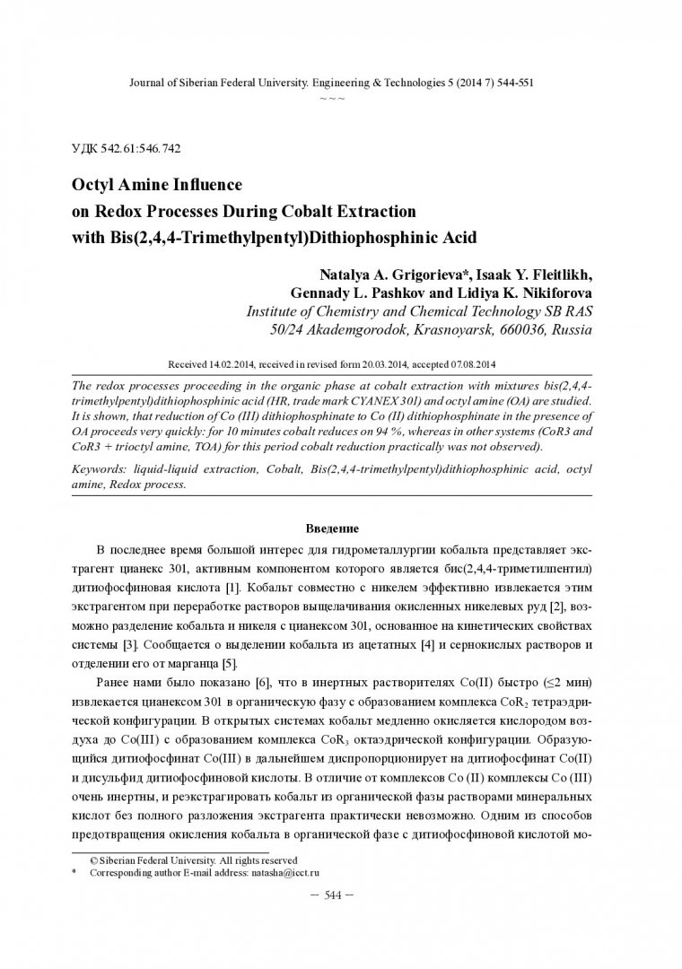 Библиографическое описание:Влияние октиламина на окислительно-восстановительные процессы при экстракции кобальта бис(2,4,4-триметилпентил) дитиофосфиновой кислотой = Octyl Amine In? uence on Redox Processes During Cobalt Extraction with Bis(2,4,4-Trimethylpentyl)Dithiophosphinic Acid / Н. А. Григорьева [и др.]. - Текст : непосредственный // Журнал Сибирского федерального университета. Техника и технологии. - 2014. - Т. 7, № 5. - С. 544-551 : рис. - Библиогр.: с. 550. - ISSN 1999-494X.