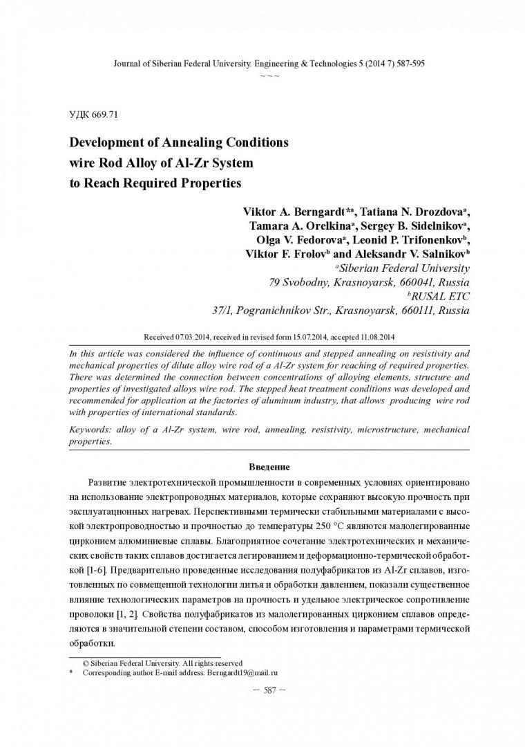 Библиографическое описание: Разработка режимов отжига катанки из сплавов системы Al-Zr для достижения заданного комплекса свойств = Development of Annealing Conditions wire Rod Alloy of Al-Zr System to Reach Required Properties / В. А. Бернгардт [и др.]. - Текст : непосредственный // Журнал Сибирского федерального университета. Техника и технологии. - 2014. - Т. 7, № 5. - С. 587-595 : рис., табл. - Библиогр.: с. 594. - ISSN 1999-494X.