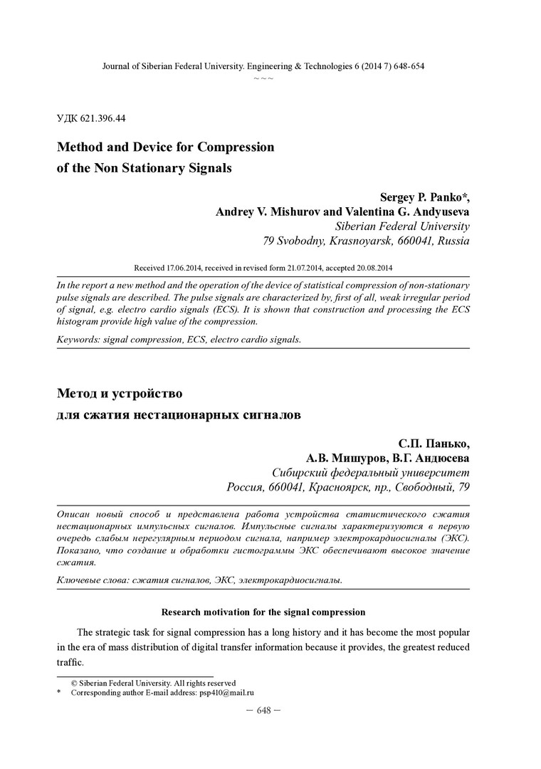 Библиографическое описание: Panko, S. P. Method and Device for Compression of the Non Stationary Signals = Метод и устройство для сжатия нестационарных сигналов / S. P. Panko, A. V. Mishurov, V. G. Andyuseva. - Текст : непосредственный // Журнал Сибирского федерального университета. Техника и технологии. - 2014. - Т. 7, № 6. - С. 648-654 : рис., табл., формулы. - Библиогр.: с. 653-654. - ISSN 1999-494X.