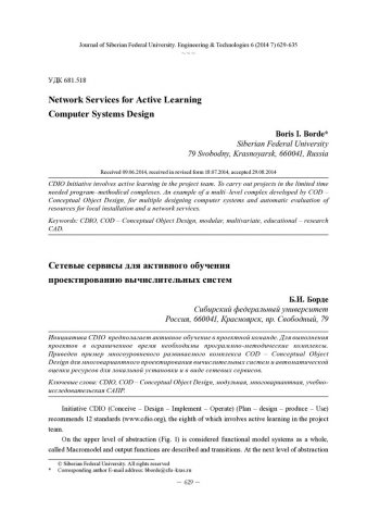 Библиографическое описание: Borde, B. I. Network Services for Active Learning Computer Systems Design = Сетевые сервисы для активного обучения проектированию вычислительных систем / B. I. Borde. - Текст : непосредственный // Журнал Сибирского федерального университета. Техника и технологии. - 2014. - Т. 7, № 6. - С. 629-635 : рис., табл. - Библиогр.: с. 634-635. - ISSN 1999-494X.