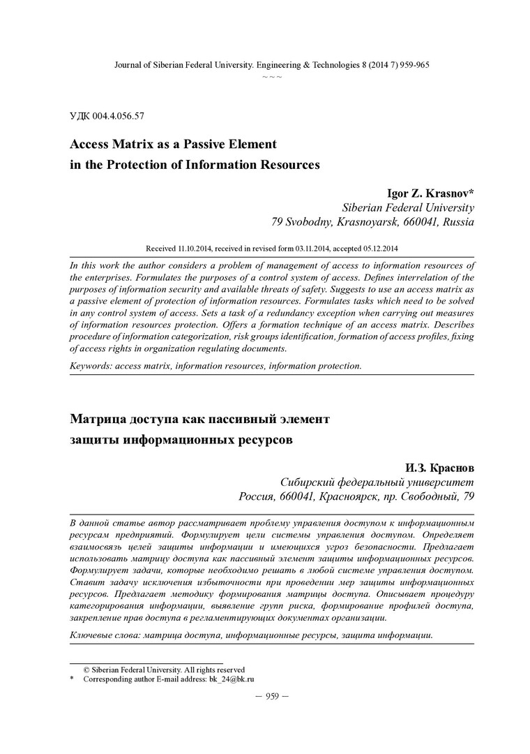 Библиографическое описание: Krasnov, Igor Z... Access Matrix as a Passive Element in the Protection of Information Resources = Матрица доступа как пассивный элемент защиты информационных ресурсов / I. Z. Krasnov. - Текст : непосредственный // Журнал Сибирского федерального университета. Техника и технологии. - 2014. - Т. 7, № 8. - С. 959-965. - Библиогр.: с. 964-965. - ISSN 1999-494X.
