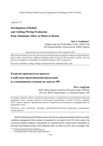 Библиографическое описание:Gorbunov, Juri A... Development of Rolled and Cabling-Wiring Production from Aluminum Alloys at Plants in Russia = Развитие производства проката и кабельно-проводниковой продукции из алюминиевых сплавов на заводах РФ / J. A. Gorbunov. - Текст : непосредственный // Журнал Сибирского федерального университета. Техника и технологии. - 2014. - Т. 7, № 8. - С. 938-946. - ISSN 1999-494X.