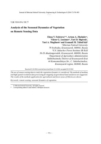 Библиографическое описание:Анализ сезонной динамики растительного покрова на основе данных дистанционного зондирования Земли / Е. В. Федотова, А. А. Жолудев, В. Г. Изосимов [и др.]. - Текст : непосредственный // Журнал Сибирского федерального университета. Техника и технологии. - 2014. - Т. 7, № 8. - С. 976-983. - Библиогр.: с. 982-983. - ISSN 1999-494X.