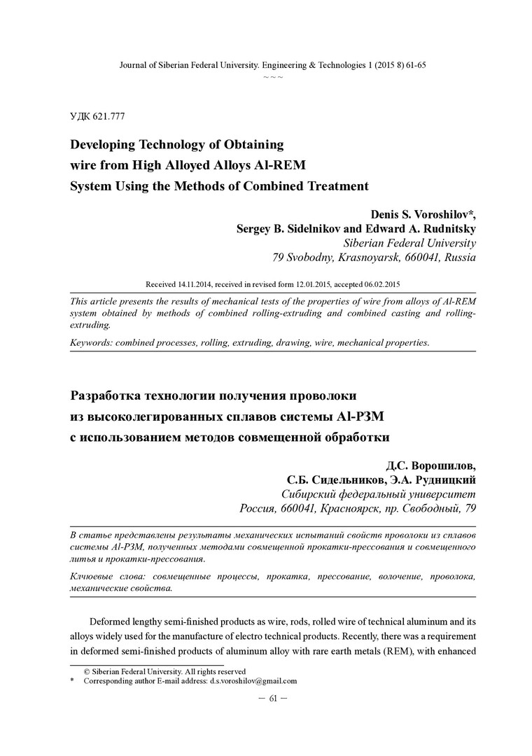 Библиографическое описание:Voroshilov, D. S. Developing Technology of Obtaining wire from High Alloyed Alloys AL-REM System Using the Methods of Combined Treatment = Разработка технологии получения проволоки из высоколегированных сплавов системы Al-РЗМ с использованием методов совмещенной обработки / D. S. Voroshilov, S. B. Sidelnikov, E. A. Rudnitsky. - Текст : непосредственный // Журнал Сибирского федерального университета. Техника и технологии. - 2015. - Т. 8, № 1. - С. 61-65 : рис., табл. - Библиогр.: с. 65. - ISSN 1999-494X.