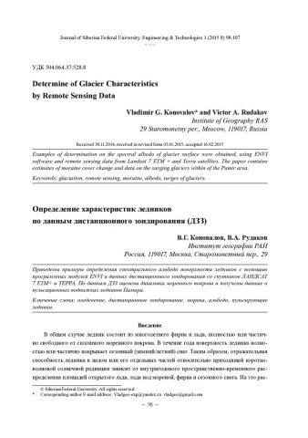 Библиографическое описание:Коновалов, В. Г. Определение характеристик ледников по данным дистанционного зондирования (ДЗЗ) = Determine of Glacier Characteristics by Remote Sensing Data / В. Г. Коновалов, В. А. Рудаков. - Текст : непосредственный // Журнал Сибирского федерального университета. Техника и технологии. - 2015. - Т. 8, № 1. - С. 98-107 : рис., табл. - Библиогр.: с. 106-107. - ISSN 1999-494X.