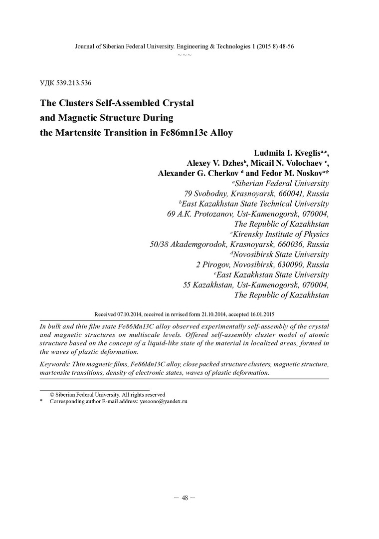 Библиографическое описание: The Clusters Self-Assembled Crystal and Magnetic Structure During the Martensite Transition in Fe86mn13c Alloy = Кластерная самоорганизация кристаллической и магнитной структур в процессе мартенситного превращения в сплаве Fe86Mn13C / L. I. Kveglis [и др.]. - Текст : непосредственный // Журнал Сибирского федерального университета. Техника и технологии. - 2015. - Т. 8, № 1. - С. 48-56 : рис. - Библиогр.: с. 56. - ISSN 1999-494X.