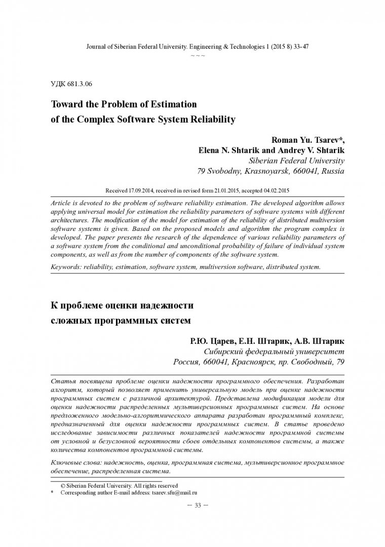 Библиографическое описание: Царев, Р. Ю. К проблеме оценки надежности сложных программных систем = Toward the Problem of Estimation of the Complex Software System Reliability / Р. Ю. Царев, Е. Н. Штарик, А. В. Штарик. - Текст : непосредственный // Журнал Сибирского федерального университета. Техника и технологии. - 2015. - Т. 8, № 1. - С. 33-47 : рис., формулы. - Библиогр.: с. 46-47. - ISSN 1999-494X.