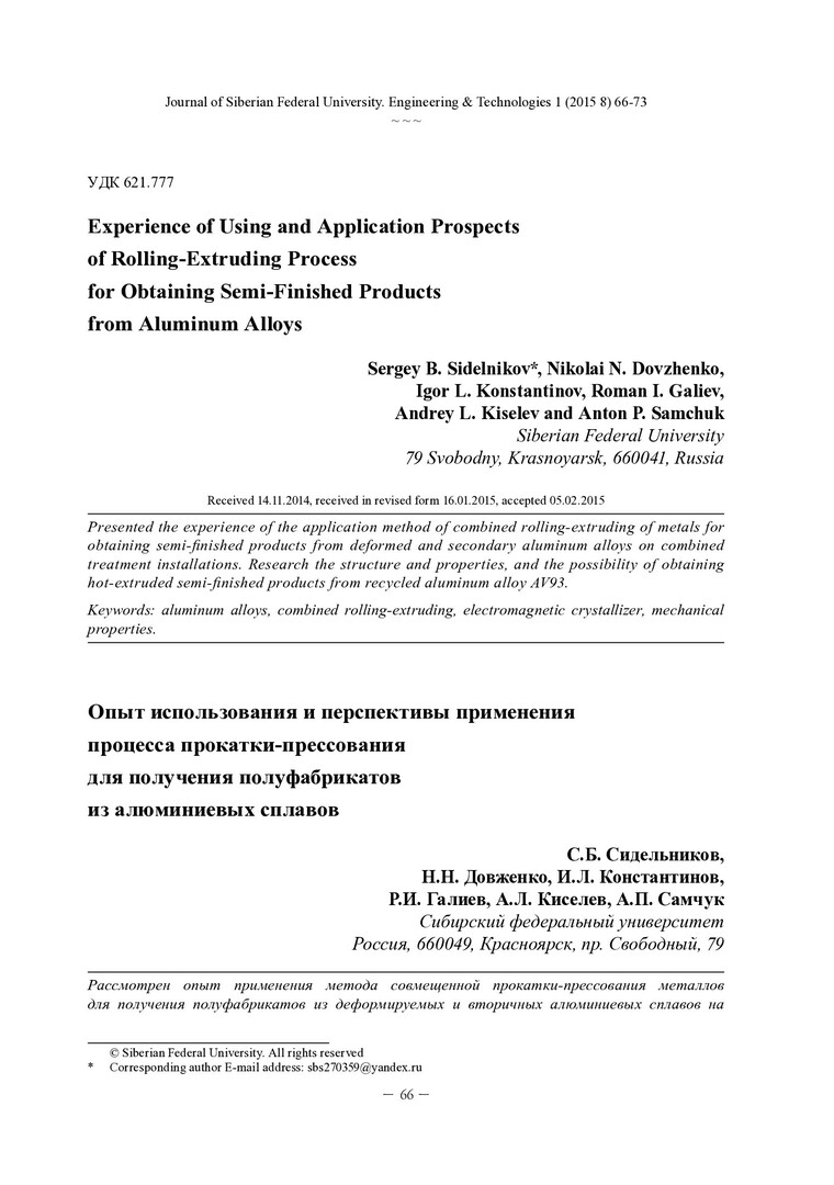 Библиографическое описание:Experience of Using and Application Prospects of Rolling-Extruding Process for Obtaining Semi-Finished Products from Aluminum Alloys = Опыт использования и перспективы применения процесса прокатки-прессования для получения полуфабрикатов из алюминиевых сплавов / S. B. Sidelnikov [и др.]. - Текст : непосредственный // Журнал Сибирского федерального университета. Техника и технологии. - 2015. - Т. 8, № 1. - С. 66-73 : рис., табл. - Библиогр.: с. 73. - ISSN 1999-494X.