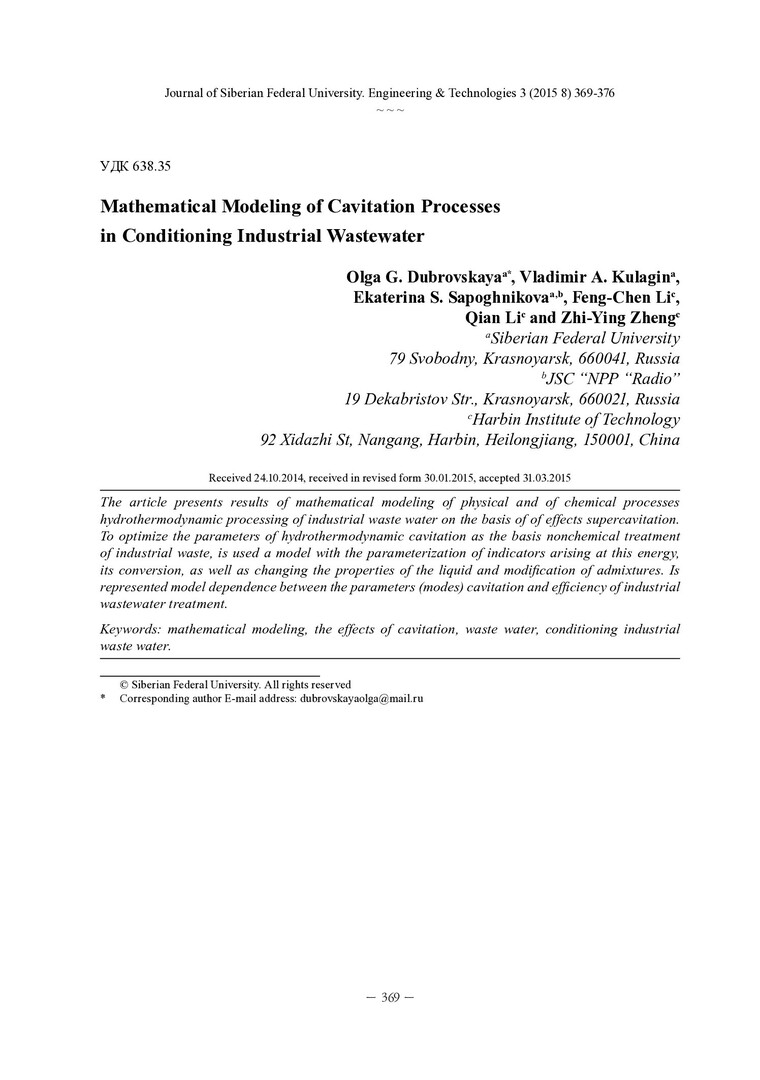 Библиографическое описание: Математическое моделирование кавитационных процессов при кондиционировании промышленных сточных вод = Mathematical Modeling of Cavitation Processes in Conditioning Industrial Wastewater / О. Г. Дубровская [и др.]. - Текст : непосредственный // Журнал Сибирского федерального университета. Техника и технологии. - 2015. - Т. 8, № 3. - С. 369-376 : рис., табл., формулы. - Библиогр.: с. 376. - ISSN 1999-494X.