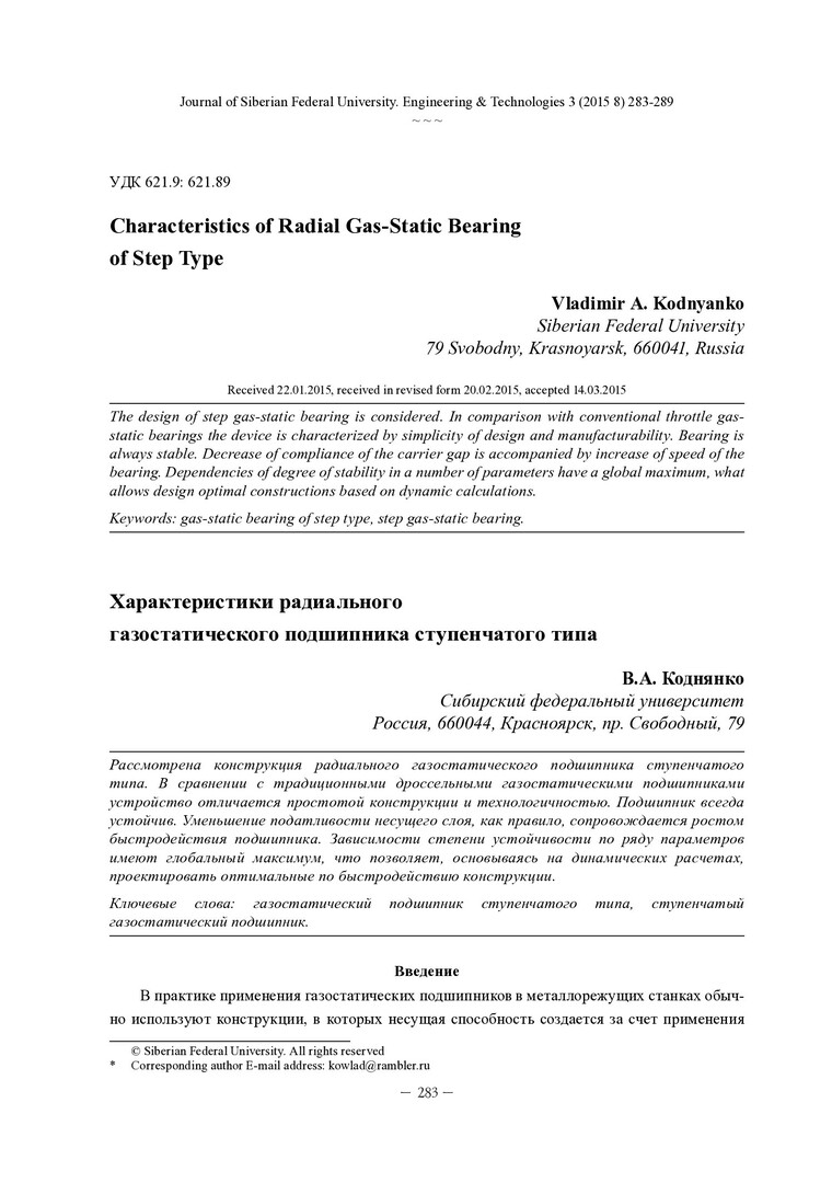 Библиографическое описание: Коднянко, В. А. Характеристики радиального газостатического подшипника ступенчатого типа = Characteristics of Radial Gas-Static Bearing of Step Type / В. А. Коднянко. - Текст : непосредственный // Журнал Сибирского федерального университета. Техника и технологии. - 2015. - Т. 8, № 3. - С. 283-289 : рис., формулы. - Библиогр.: с. 289. - ISSN 1999-494X.