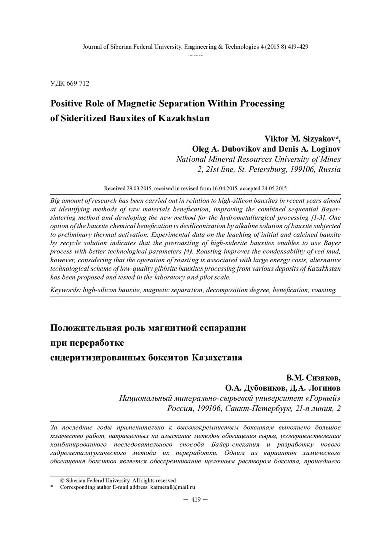 Библиографическое описание: Sizyakov, V. М. Positive Role of Magnetic Separation Within Processing of Sideritized Bauxites of Kazakhstan = Положительная роль магнитной сепарации при переработке сидеритизированных бокситов Казахстана / V. М. Sizyakov, О. А. Dubovikov, D. A. Loginov. - Текст : непосредственный // Журнал Сибирского федерального университета. Техника и технологии. - 2015. - Т. 8, № 4. - С. 419-429 : рис., табл. - Библиогр.: с. 429. - ISSN 1999-494X.