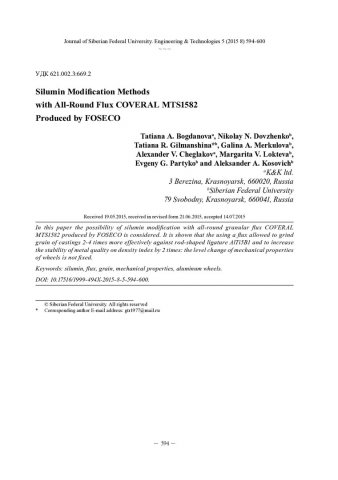 Библиографическое описание: Способы модифицирования силуминов комплексным флюсом COVERAL MTS1582 производства FOSECO = Silumin Modification Methods with All-Round Flux COVERAL MTS1582 Produced by FOSECO / Т. А. Богданова [и др.]. - Текст : непосредственный // Журнал Сибирского федерального университета. Техника и технологии. - 2015. - Т. 8, № 5. - С. 594-600 : рис., табл. - Библиогр.: с. 600. - ISSN 1999-494X.