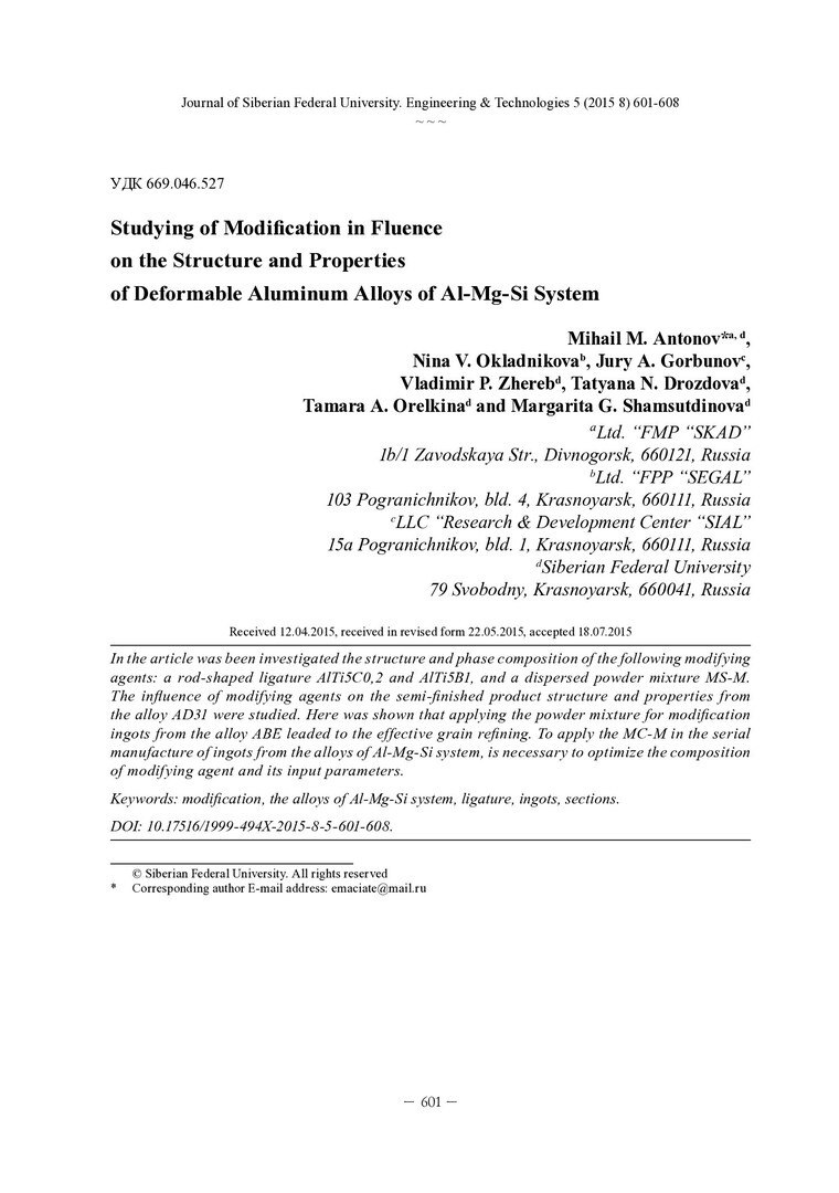 Библиографическое описание: Влияние модифицирования на структуру и свойства деформируемых сплавов системы Al-Mg-Si = Studying of Modification in Fluence on the Structure and Properties of Deformable Aluminum Alloys of Al-Mg-Si System / М. М. Антонов [и др.]. - Текст : непосредственный // Журнал Сибирского федерального университета. Техника и технологии. - 2015. - Т. 8, № 5. - С. 601-608 : рис., табл. - Библиогр.: с. 608. - ISSN 1999-494X.