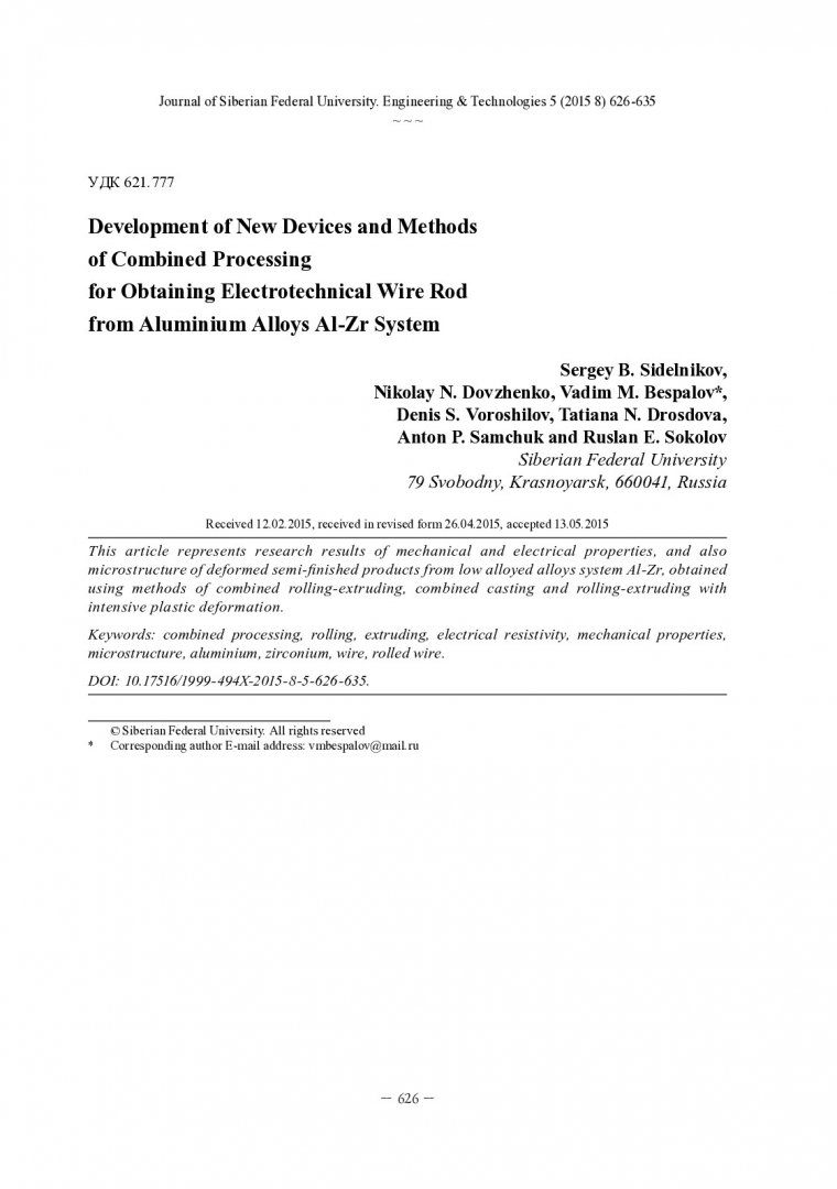 Библиографическое описание:Разработка новых устройств и способов совмещенной обработки для получения электротехнической катанки из алюминиевых сплавов системы Аl-Zr = Development of New Devices and Methods of Combined Processing for Obtaining Electrotechnical Wire Rod from Aluminium Alloys Al-Zr System / С. Б. Сидельников [и др.]. - Текст : непосредственный // Журнал Сибирского федерального университета. Техника и технологии. - 2015. - Т. 8, № 5. - С. 626-635 : рис., табл. - Библиогр.: с. 635. - ISSN 1999-494X.