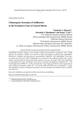 Библиографическое описание: Харук, В. И. Климатогенная динамика солифлюкции в мерзлотной зоне Средней Сибири = Climatogenic Dynamics of Soli? uction in the Permafrost Zone of Central Siberia / В. И. Харук, А. С. Шушпанов, С. Т. Им. - Текст : непосредственный // Журнал Сибирского федерального университета. Техника и технологии. - 2015. - Т. 8, № 6. - С. 744-754 : рис. - Библиогр.: с. 752-754. - ISSN 1999-494X.