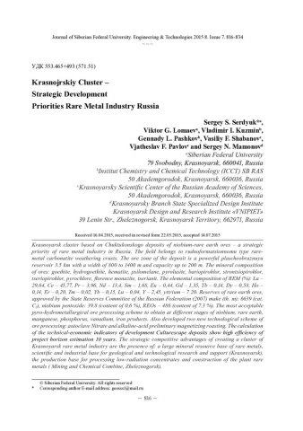 Библиографическое описание: Красноярский кластер - стратегический приоритет развития редкометалльной промышленности России = Krasnojrskiy Cluster - Strategic Development Priorities Rare Metal Industry Russia / С. С. Сердюк [и др.]. - Текст : непосредственный // Журнал Сибирского федерального университета. Техника и технологии. - 2015. - Т. 8, № 7. - С. 816-834 : рис., табл. - Библиогр.: с. 833-834. - ISSN 1999-494X.