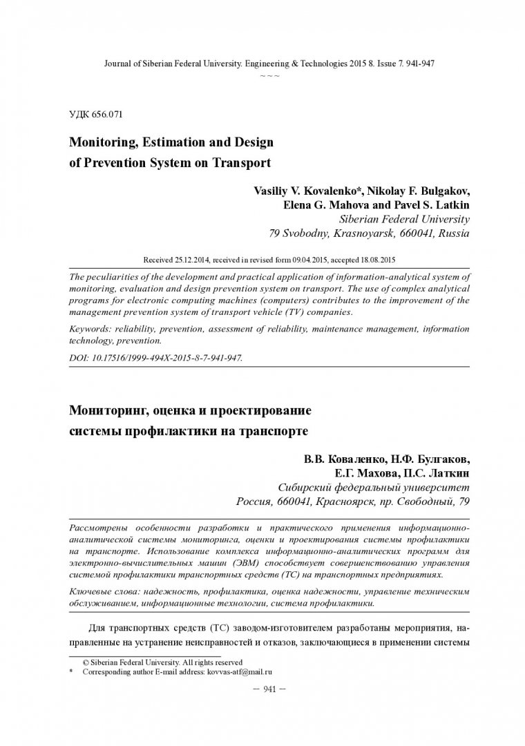 Библиографическое описание: Мониторинг, оценка и проектирование системы профилактики на транспорте = Monitoring, Estimation and Design of Prevention System on Transport / В. В. Коваленко [и др.]. - Текст : непосредственный // Журнал Сибирского федерального университета. Техника и технологии. - 2015. - Т. 8, № 7. - С. 941-947 : рис. - Библиогр.: с. 947. - ISSN 1999-494X.