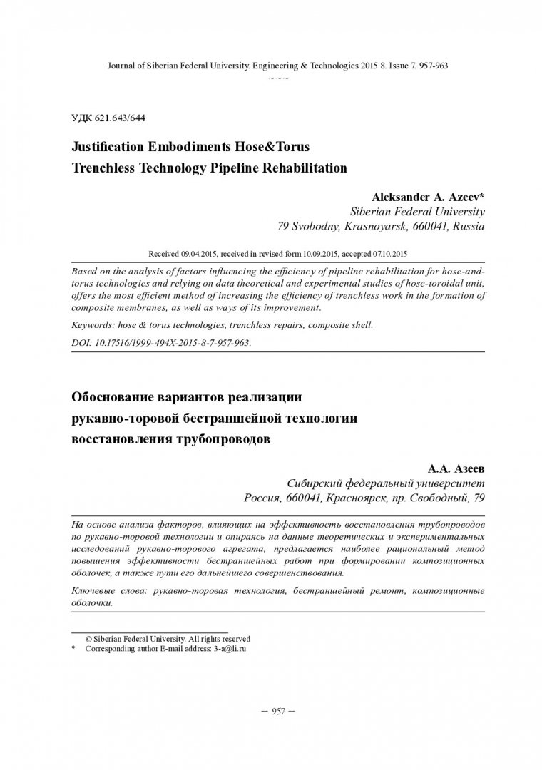 Библиографическое описание:Азеев, А. А. Обоснование вариантов реализации рукавно-торовой бестраншейной технологии восстановления трубопроводов = Justification Embodiments Hose&Torus Trenchless Technology Pipeline Rehabilitation / А. А. Азеев. - Текст : непосредственный // Журнал Сибирского федерального университета. Техника и технологии. - 2015. - Т. 8, № 7. - С. 957-963 : рис., табл. - Библиогр.: с. 962-963. - ISSN 1999-494X.