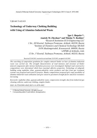 Библиографическое описание: Шепелев, И. И. Технология строительства дорожных одежд с использованием отходов глиноземного производства = Technology of Underway Clothing Building with Using of Alumina Industrial Waste / И. И. Шепелев, А. М. Жижаев, Н. Н. Бочков. - Текст : непосредственный // Журнал Сибирского федерального университета. Техника и технологии. - 2015. - Т. 8, № 8. - С. 1070-1082 : рис., табл., формулы. - Библиогр.: с. 1081-1082. - ISSN 1999-494X.