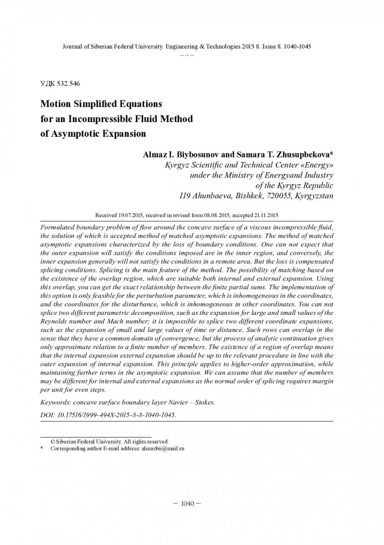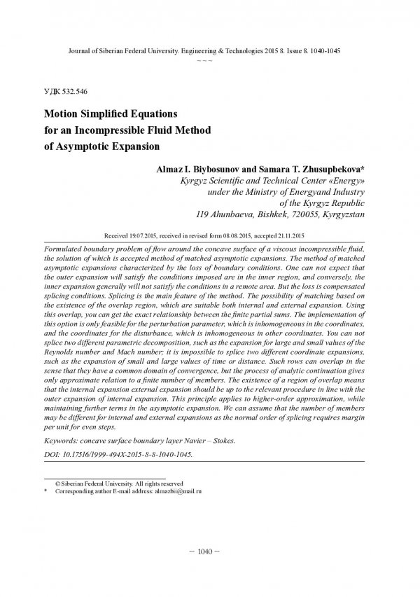 Библиографическое описание:Бийбосунов, А. И. Упрощение уравнений движения для несжимаемой жидкости методом асимптотических разложений = Motion Simplifi ed Equations for an Incompressible Fluid Method of Asymptotic Expansion / А. И. Бийбосунов, С. Т. Жусупбекова. - Текст : непосредственный // Журнал Сибирского федерального университета. Техника и технологии. - 2015. - Т. 8, № 8. - С. 1040-1045 : рис., формулы. - Библиогр.: с. 1045. - ISSN 1999-494X.