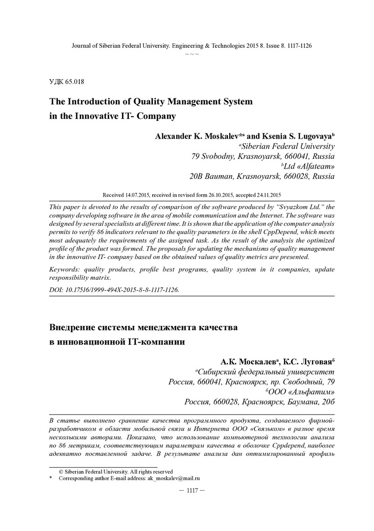 Библиографическое описание: Москалев, А. К. Внедрение системы менеджмента качества в инновационной IT-компании = The Introduction of Quality Management System in the Innovative IT- Company / А. К. Москалев, К. С. Луговая. - Текст : непосредственный // Журнал Сибирского федерального университета. Техника и технологии. - 2015. - Т. 8, № 8. - С. 1117-1126 : рис., табл., формулы. - Библиогр.: с. 1126. - ISSN 1999-494X.