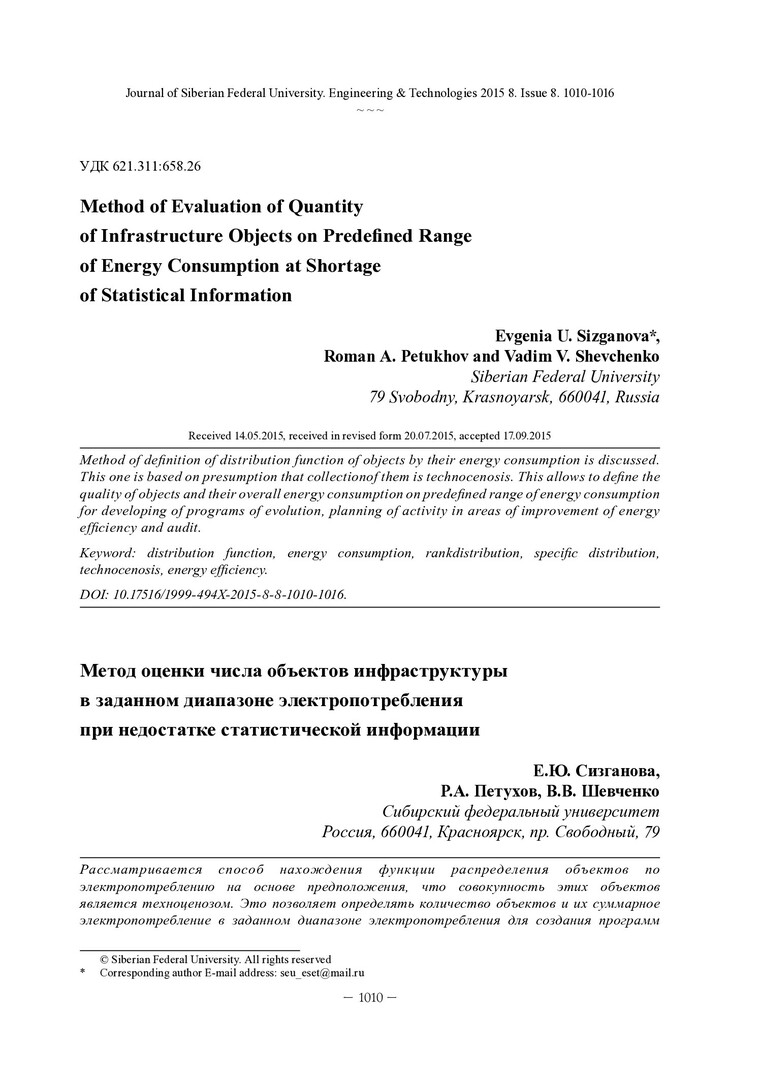 Библиографическое описание:Сизганова, Е. Ю. Метод оценки числа объектов инфраструктуры в заданном диапазоне электропотребления при недостатке статистической информации = Method of Evaluation of Quantity of Infrastructure Objects on Predefi ned Range of Energy Consumption at Shortage of Statistical Information / Е. Ю. Сизганова, Р. А. Петухов, В. В. Шевченко. - Текст : непосредственный // Журнал Сибирского федерального университета. Техника и технологии. - 2015. - Т. 8, № 8. - С. 1010-1016 : рис., формулы. - Библиогр.: с. 1016. - ISSN 1999-494X.