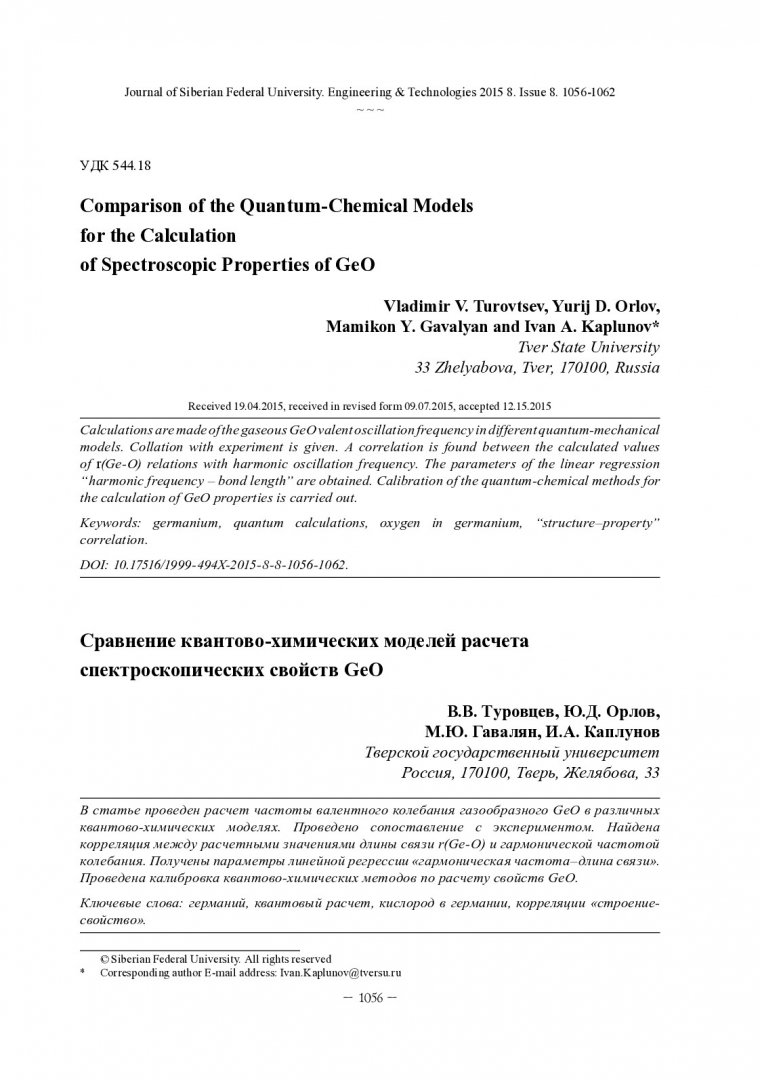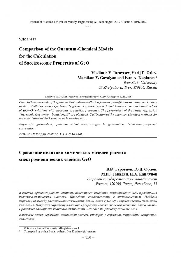 Библиографическое описание: Сравнение квантово-химических моделей расчета спектроскопических свойств GeO = Comparison of the Quantum-Chemical Models for the Calculation of Spectroscopic Properties of GeO / В. В. Туровцев [и др.]. - Текст : непосредственный // Журнал Сибирского федерального университета. Техника и технологии. - 2015. - Т. 8, № 8. - С. 1056-1062 : рис., табл. - Библиогр.: с. 1061-1062. - ISSN 1999-494X.