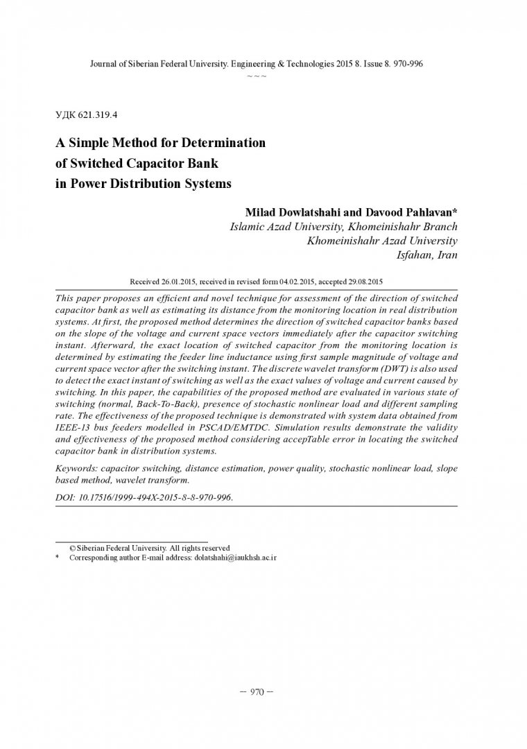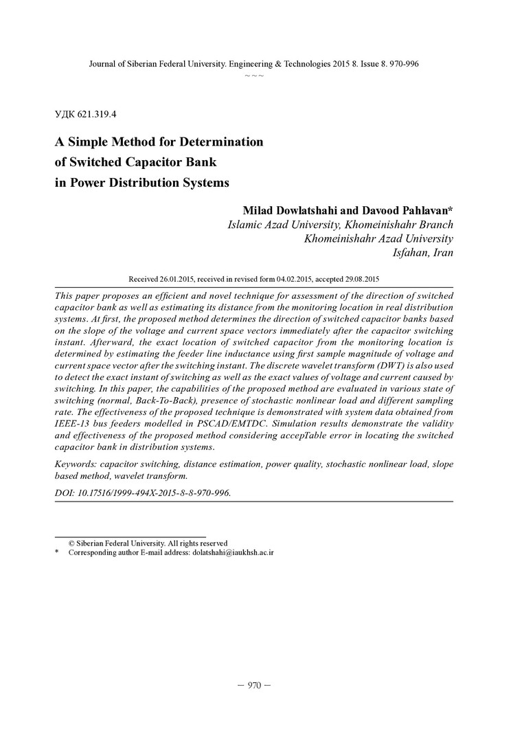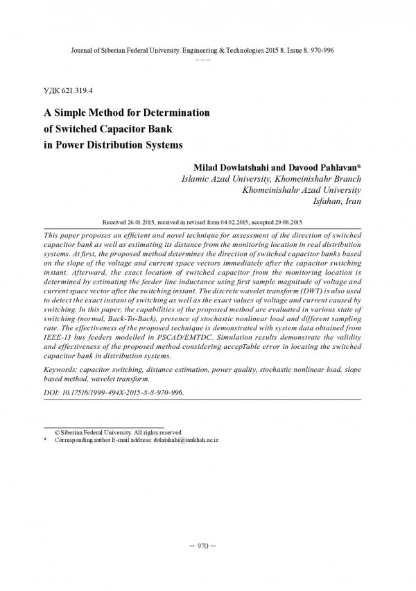 Библиографическое описание: Dowlatshahi, M. . A Simple Method for Determination of Switched Capacitor Bank in Power Distribution Systems = Простой метод для определения включения групп конденсаторов в системах распределения энергии / M. Dowlatshahi, D. Pahlavan. - Текст : непосредственный // Журнал Сибирского федерального университета. Техника и технологии. - 2015. - Т. 8, № 8. - С. 970-996 : рис., табл., формулы. - Библиогр.: с. 995-996. - ISSN 1999-494X.