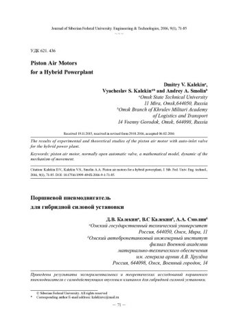 Библиографическое описание:Калекин, Д. В. Поршневой пневмодвигатель для гибридной силовой установки / Д. В. Калекин, В. С. Калекин, А. А. Смолин. - Текст : непосредственный // Журнал Сибирского федерального университета. Техника и технологии. - 2016. - Т. 9, № 1. - С. 71-85 : рис., формулы. - Библиогр.: с. 85. - ISSN 1999-494X.