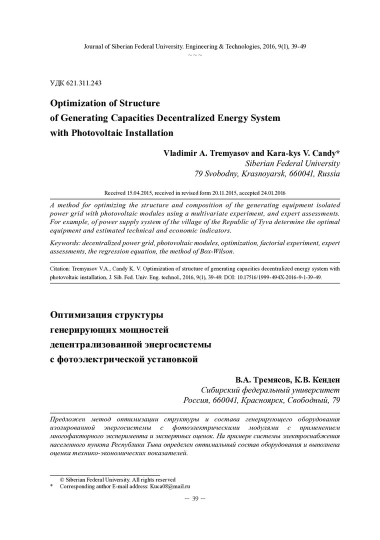 Аннотация:Предложен метод оптимизации структуры и состава генерирующего оборудования изолированной энергосистемы с фотоэлектрическими модулями с применением многофакторного эксперимента и экспертных оценок. На примере системы электроснабжения населенного пункта Республики Тыва определен оптимальный состав оборудования и выполнена оценка технико-экономических показателей.