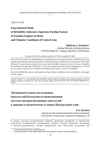 Библиографическое описание:Каюмов, Б. А. Экспериментальные исследования показателей безотказности инжекционной системы питания бензиновых двигателей в дорожно-климатических условиях Центральной Азии / Б. А. Каюмов. - Текст : непосредственный // Журнал Сибирского федерального университета. Техника и технологии. - 2016. - Т. 9, № 1. - С. 86-104 : рис., табл. - Библиогр.: с. 103-104. - ISSN 1999-494X.