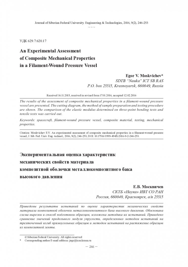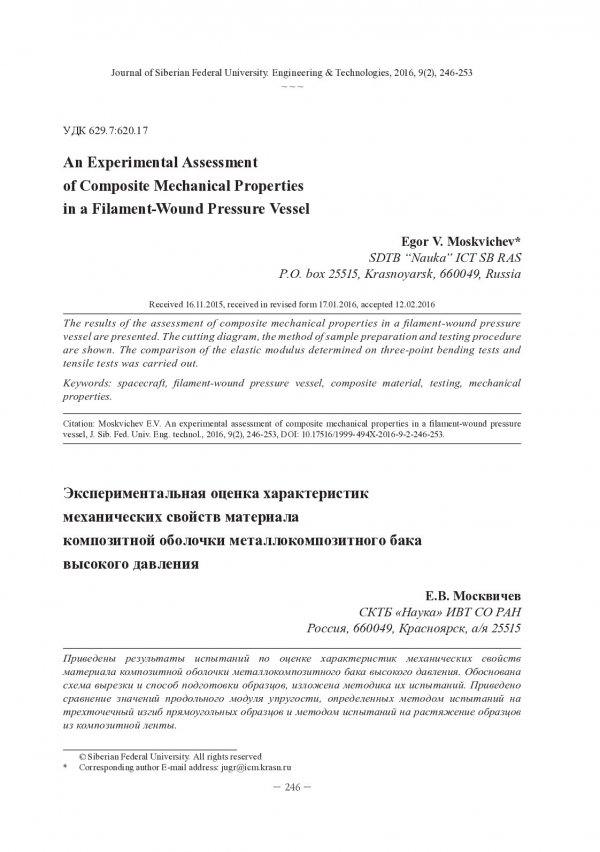 Библиографическое описание:Москвичев, Е. В. Экспериментальная оценка характеристик механических свойств материала композитной оболочки металлокомпозитного бака высокого давления = An Experimental Assesment of Composite Mechanical Properties in a Filament - Wound Pressure Vessel / Е. В. Москвичев. - Текст : непосредственный // Журнал Сибирского федерального университета. Техника и технологии. - 2016. - Т. 9, № 2. - С. 246-253 : рис., табл. - Библиогр.: с. 253. - ISSN 1999-494X.