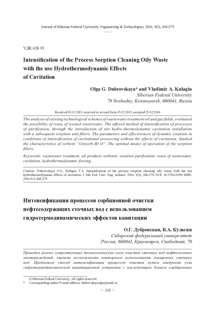 Библиографическое описание: Дубровская, О. Г. Интенсификация процессов сорбционной очистки нефтесодержащих сточных вод с использованием гидротермодинамических эффектов кавитации = Intensification of the Process Sorption Cleaning Oily Waste with the use Hydrothermodynamic Effects of Cavitation / О. Г. Дубровская, В. А. Кулагин. - Текст : непосредственный // Журнал Сибирского федерального университета. Техника и технологии. - 2016. - Т. 9, № 2. - С. 268-279 : рис., табл. - Библиогр.: с. 276-279. - ISSN 1999-494X.