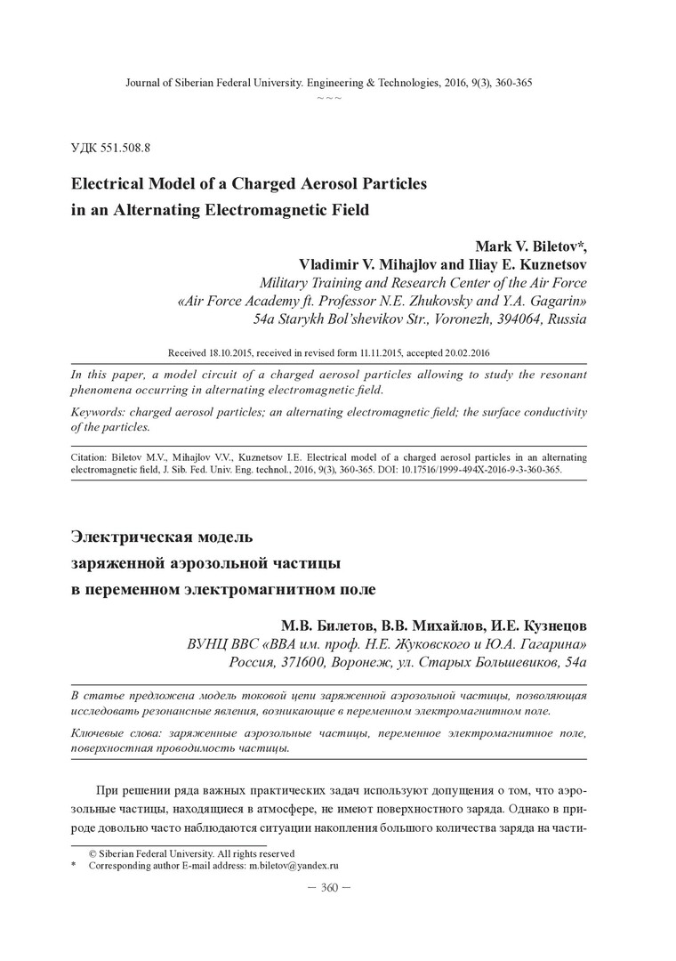 Библиографическое описание:Билетов, М. В. Электрическая модель заряженной аэрозольной частицы в переменном электромагнитном поле = Electrical Model of a Charged Aerosol Particles in an Alternating Electromagnetic Field / М. В. Билетов, В. В. Михайлов, И. Е. Кузнецов. - Текст : непосредственный // Журнал Сибирского федерального университета. Техника и технологии. - 2016. - Т. 9, № 3. - С. 360-365 : рис., формулы. - Библиогр.: с. 364-365. - ISSN 1999-494X.
