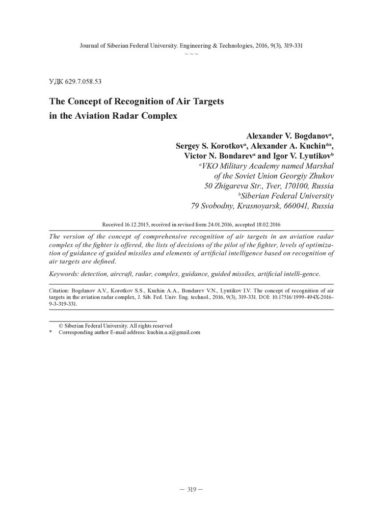Библиографическое описание: Концепция распознавания воздушных целей в авиационном радиолокационном комплексе = The Concept of Recognition of Air Targets in the Aviation Radar Complex / А. В. Богданов [и др.]. - Текст : непосредственный // Журнал Сибирского федерального университета. Техника и технологии. - 2016. - Т. 9, № 3. - С. 319-331 : рис., табл. - Библиогр.: с. 330-331. - ISSN 1999-494X.