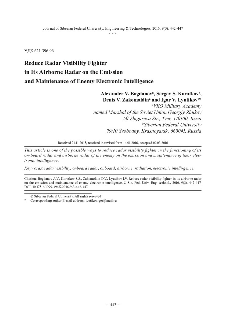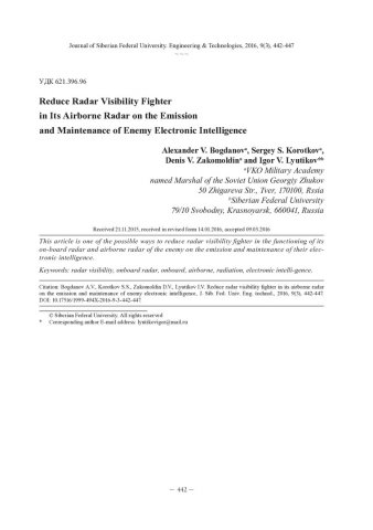 Библиографическое описание:Снижение радиолокационной заметности истребителя при работе его бортовой радиолокационной станции на излучение и при ведении противником радиотехнической разведки = Reduce Radar Visibility Fighter in Its Airborne Radar on the Emission and Maintenance of Enemy Electronic Intelligence / А. В. Богданов [и др.]. - Текст : непосредственный // Журнал Сибирского федерального университета. Техника и технологии. - 2016. - Т. 9, № 3. - С. 442-447 : рис., табл., формулы. - Библиогр.: с. 447. - ISSN 1999-494X.
