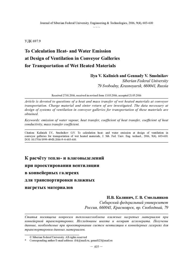 Библиографическое описание:Калинич, И. В. К расчёту тепло- и влаговыделений при проектировании вентиляции в конвейерных галереях для транспортировки влажных нагретых материалов = To Calculation Heatand Water Emission at Design of Ventilation in Conveyor Galleries for Transportation of Wet Heated Materials / И. В. Калинич, Г. В. Смольников. - Текст : непосредственный // Журнал Сибирского федерального университета. Техника и технологии. - 2016. - Т. 9, № 4. - С. 603-610 : рис., формулы. - Библиогр.: с. 609-610. - ISSN 1999-494X.