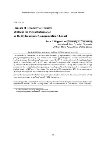 Библиографическое описание: Filippov, B. I. Increase of Reliability of Transfer of Blocks the Digital Information on the Hydroacoustic Communication Channel = Повышение достоверности передачи блоков цифровой информации по гидроакустическому каналу связи / B. I. Filippov, G. A. Chernetsky. - Текст : непосредственный // Журнал Сибирского федерального университета. Техника и технологии. - 2016. - Т. 9, № 4. - С. 489-499 : табл., рис., формулы. - Библиогр.: с. 498-499. - ISSN 1999-494X.