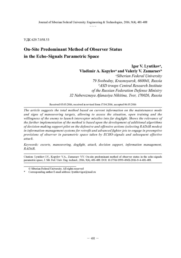 Библиографическое описание: Лютиков, И. В. Метод занятия преимущественного положения наблюдателя в параметрическом пространстве принимаемых эхо-сигналов = On-Site Predominant Method of Observer Status in the Echo-Signals Parametric Space / И. В. Лютиков, В. А. Копылов, В. В. Замараев. - Текст : непосредственный // Журнал Сибирского федерального университета. Техника и технологии. - 2016. - Т. 9, № 4. - С. 481-488 : табл., формулы. - Библиогр.: с. 488. - ISSN 1999-494X.
