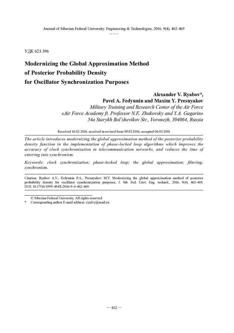 Библиографическое описание:Ryabov, A. V. Modernizing the GlobaL Approximation Method of Posterior Probability Density for Oscillator Synchronization Purposes = Модернизация метода интегральной аппроксимации апостериорной плотности вероятности в задачах тактовой синхронизации генераторов / A. V. Ryabov, P. A. Fedyunin, M. Y. Presnyakov. - Текст : непосредственный // Журнал Сибирского федерального университета. Техника и технологии. - 2016. - Т. 9, № 4. - С. 462-469 : рис., формулы. - Библиогр.: с. 469. - ISSN 1999-494X.