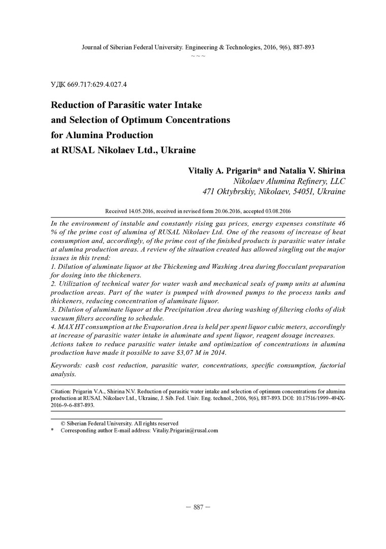 Библиографическое описание: Пригарин, В. А. Снижение ввода паразитической воды и подбор оптимальных концентрационных режимов глиноземного производства на ООО «НГЗ» (Украина) = Reduction of Parasitic water Intake and Selection of Optimum Concentrations for Alumina Production at RUSAL Nikolaev Ltd., Ukraine / В. А. Пригарин, Н. В. Ширина. - Текст : непосредственный // Журнал Сибирского федерального университета. Техника и технологии. - 2016. - Т. 9, № 6. - С. 887-893 : рис., табл. - ISSN 1999-494X.