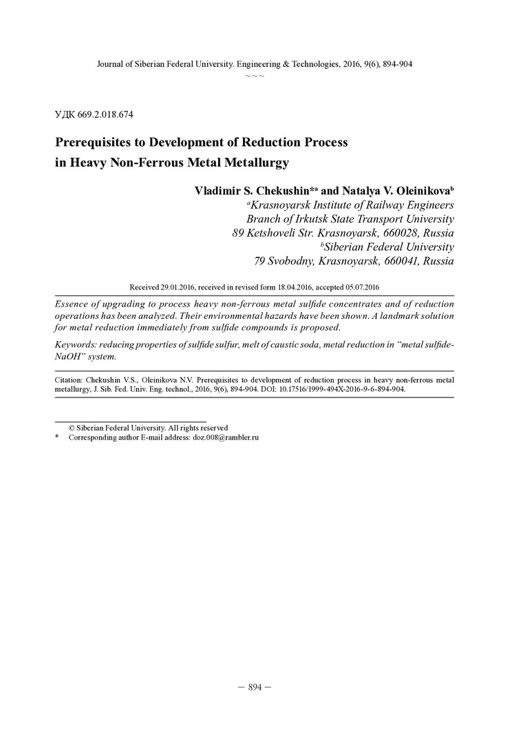 Библиографическое описание: Chekushin, V. S. Prerequisites to Development of Reduction Process in Heavy Non-Ferrous Metal Metallurgy = Предпосылки совершенствования восстановительных процессов в металлургии тяжелых цветных металлов / V. S. Chekushin, N. V. Oleinikova. - Текст : непосредственный // Журнал Сибирского федерального университета. Техника и технологии. - 2016. - Т. 9, № 6. - С. 894-904 : рис., табл. - Библиогр.: с. 903-904. - ISSN 1999-494X.