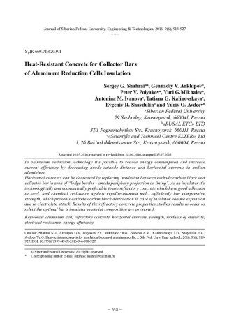 Библиографическое описание: Жаростойкий бетон для электроизоляции блюмсов алюминиевых электролизеров = Heat-Resistant Concrete for Collector Bars of Aluminum Reduction Сells Insulation / С. Г. Шахрай [и др.]. - Текст : непосредственный // Журнал Сибирского федерального университета. Техника и технологии. - 2016. - Т. 9, № 6. - С. 918-927 : рис., табл. - Библиогр.: с. 926-927. - ISSN 1999-494X.